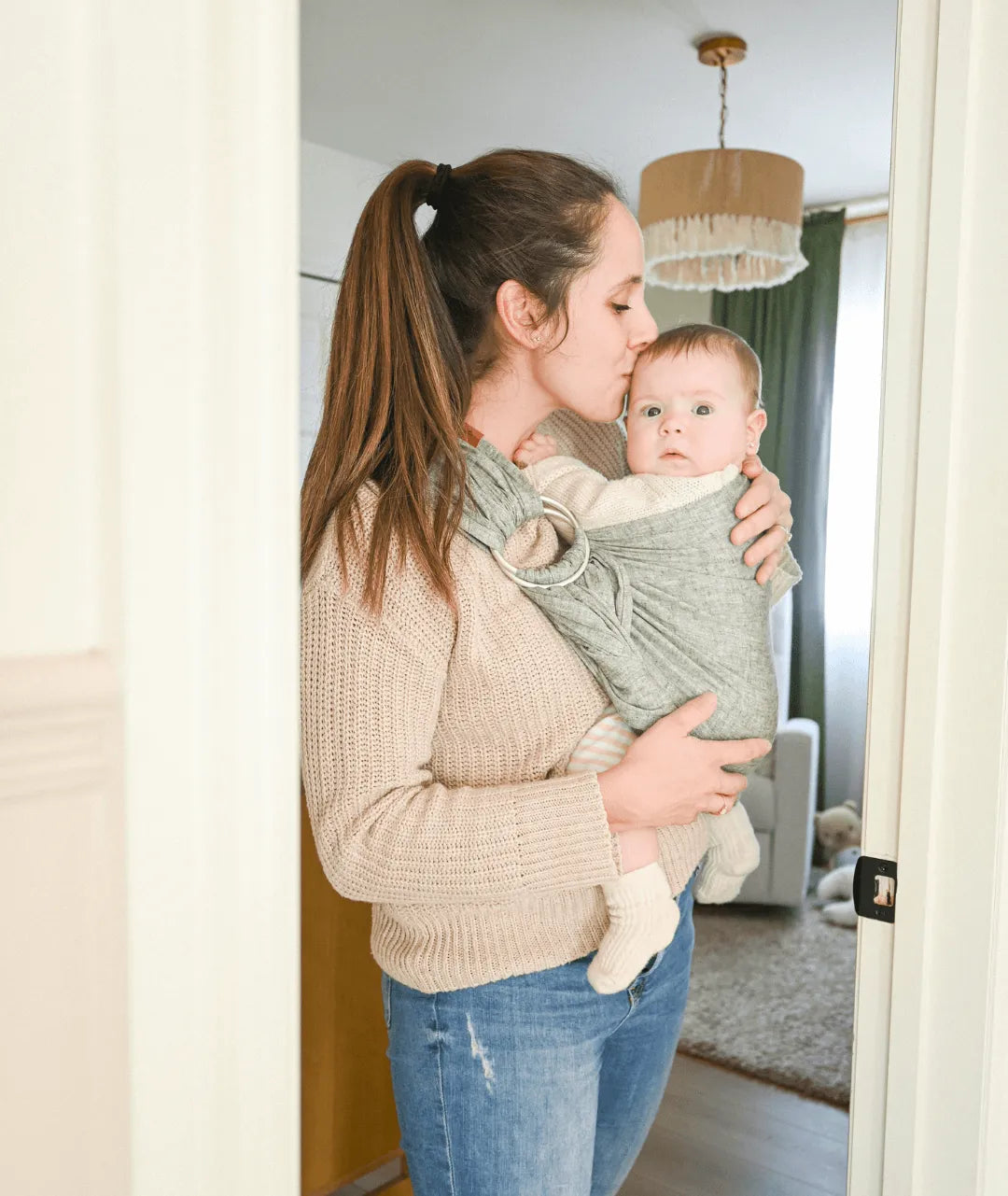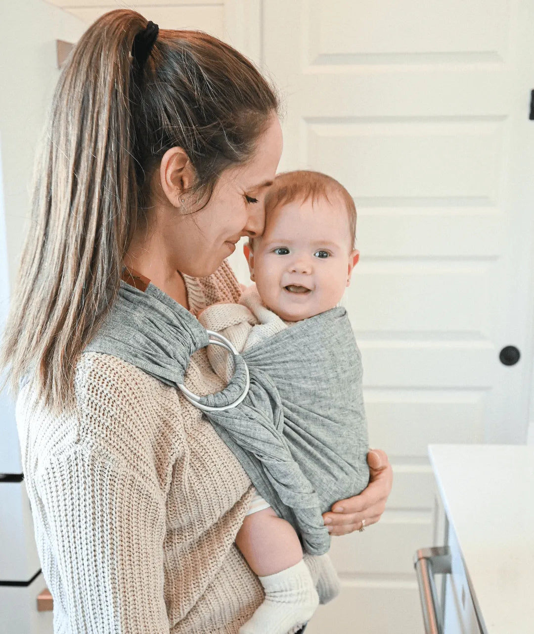 Bébé veut vos bras… tout de suite? 😅 Le ring sling est votre solution express: on l’enfile, on ajuste, et bébé est blotti contre vous en quelques secondes.