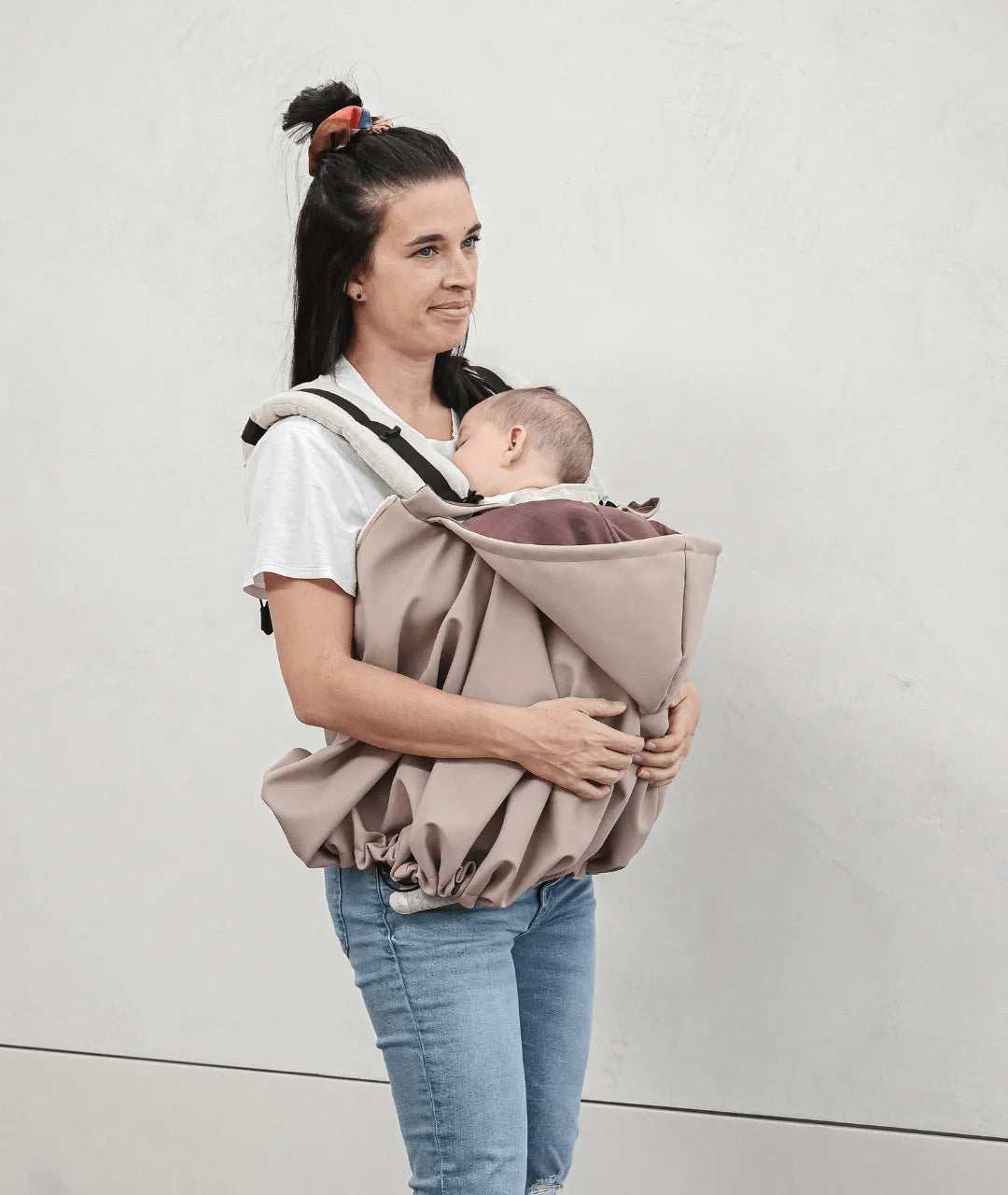 Peut être porté par-dessus un porte-bébé. Le produit est vendu avec des petites sangles qui servent à accrocher la housse sur les bretelles d'un porte-bébé.