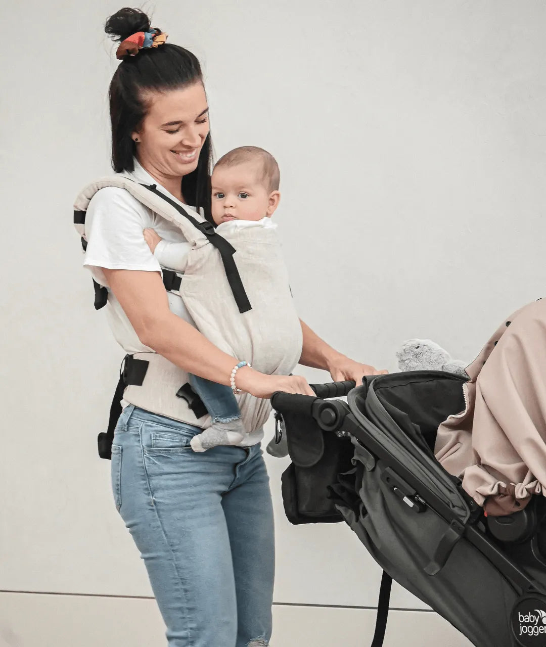 Notes: Le Gustine Évolution est un porte-bébé complètement ajustable. Il vous permet de modifier la hauteur et la largeur en fonction de l’évolution de votre bébé sans devoir utiliser un rehausseur.